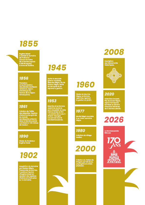 L’histoire de la Bambouseraie en Cévennes est longue depuis 170 ans. Elle reflète la passion d’hommes et femmes attachés à leur environnement, au spectacle vivant et à ses possibilités insoupçonnées comme à l’inspiration qu’elle offre encore et encore aux artistes d’aujourd’hui et de demain. Un lieu chargé d’histoire mais résolument inscrit dans notre époque et toujours tourné vers l’avenir.