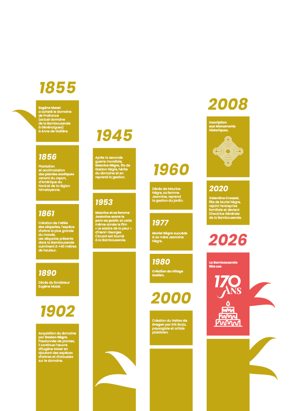 L’histoire de la Bambouseraie en Cévennes est longue depuis 170 ans. Elle reflète la passion d’hommes et femmes attachés à leur environnement, au spectacle vivant et à ses possibilités insoupçonnées comme à l’inspiration qu’elle offre encore et encore aux artistes d’aujourd’hui et de demain. Un lieu chargé d’histoire mais résolument inscrit dans notre époque et toujours tourné vers l’avenir.